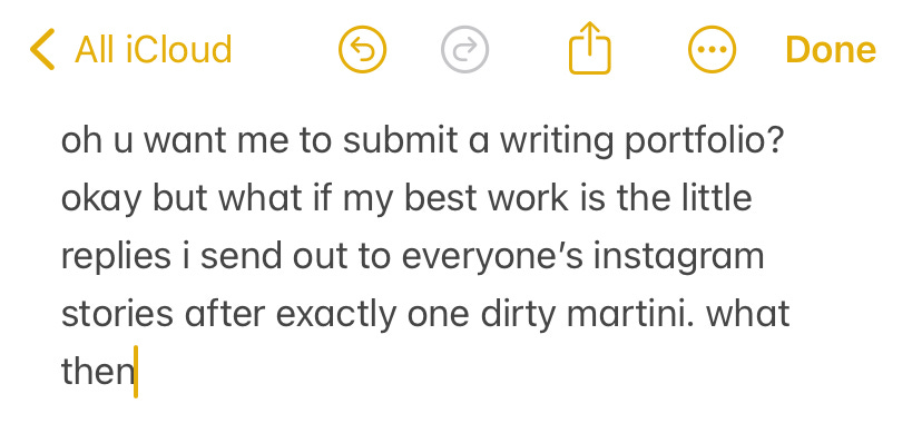 Meanwhile my own portfolio consists of a children's book I've sworn for ten years I'm going to publish soon, a novel I insist I'm working on but that I haven't touched in a month, and scraps of online essays that don't even live on the internet anymore. Can I actually keep calling myself a writer when I've never seen a writing project all the way through? I don't know how I'm supposed to commit to finishing a 350-page novel when I can barely even commit to the city I uprooted my entire life for.